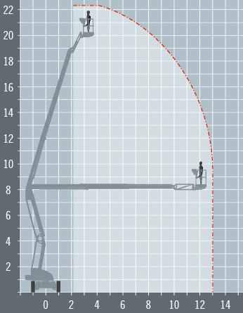 This electric self-propelled articulated boom by Dingli features a maximum working height of 22.21m and a maximum payload of 230kg. This electric self-propelled articulated boom is suitable for large-scale indoor or outdoor applications such as airports, shopping malls, etc.