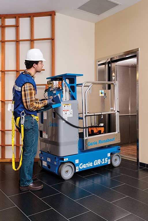 The Genie GR15 has a compact chassis meaning it can travel in passenger elevators and the operator can drive it through doorways, increasing productivity. Ideal for a range of maintenance activities, the intuitive joystick controls offer proportional lift and drive for a smooth ride.