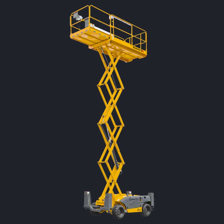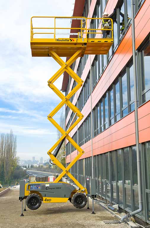 The Haulotte Compact 12DX diesel scissor lift has 4 wheel drive and rough terrain tyres and is perfect for working on construction sites. Hydraulic outriggers keep the platform stable while the extending platform provides over 3.7 metres of usable platform that can lift several operators and equipment with ease.