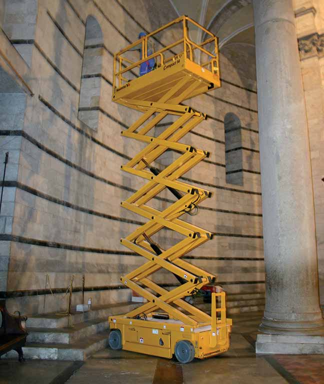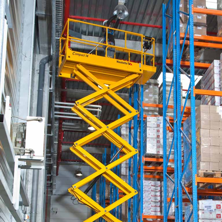 The Haulotte compact 14 electric scissor lift is a robust and reliable scissor for indoor use. With its compact width at just 1.2 meters the Compact 14 is an ideal choice for large high bay warehouses that have width restrictions.